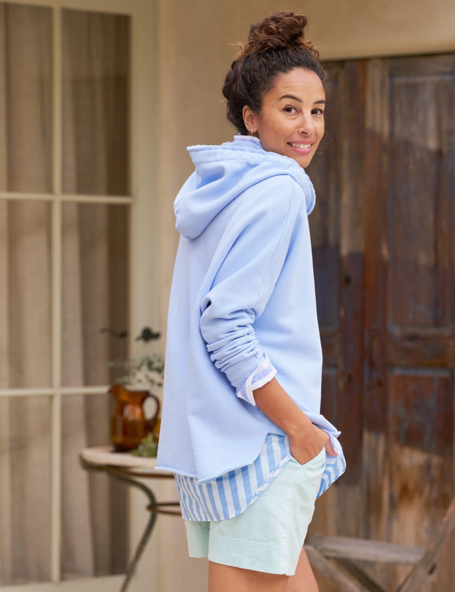 Kane’s roomy fit and functional hood create the perfect pullover! The feminine drape and comfy continuous seam sleeves are so flattering for busy days running to the gym, to brunch, or around the block with your dog.