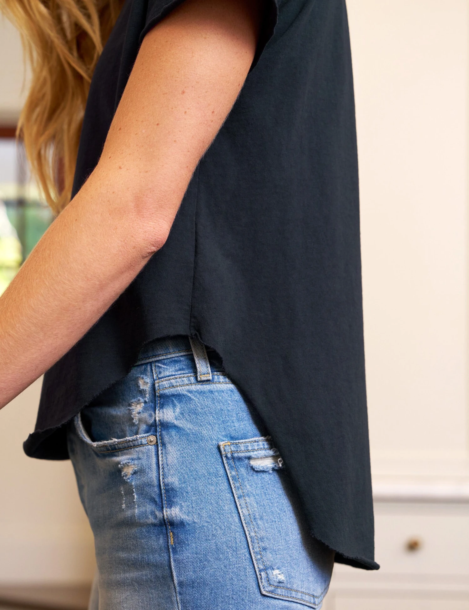 The Perfect Tee’s crew neck, curved raw hem, and just-relaxed-enough fit pair perfectly with all the other staples in your closet.